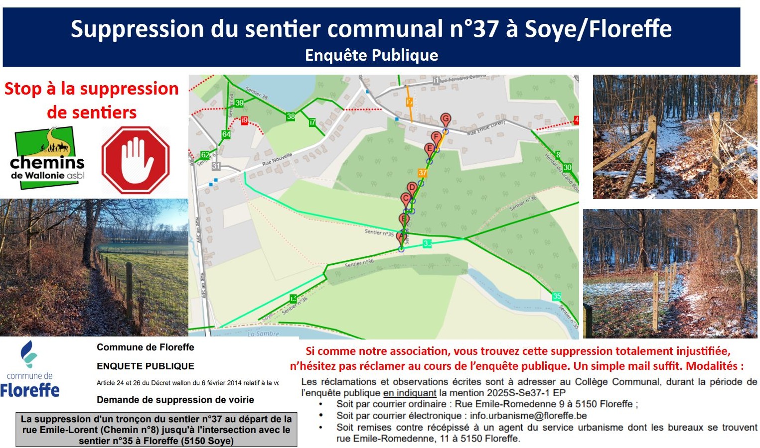 Le Collège communal de Floreffe fait savoir, qu’une demande de suppression partielle de sentier a été introduite auprès du Conseil communal de Floreffe. La suppression d'un tronçon du sentier n° 37 au départ de la rue Emile-Lorent (Chemin n°8) jusqu'à l'intersection avec le sentier n° 35 à Soye se situe à hauteur des parcelles cadastrées division 3, section B n°424S9, 424T9, 424V, 444. Date d’affichage de la demande: 12 juin 2025 Période de l’enquête publique: du 13 juin 2025 au 15 juillet 2025 | |